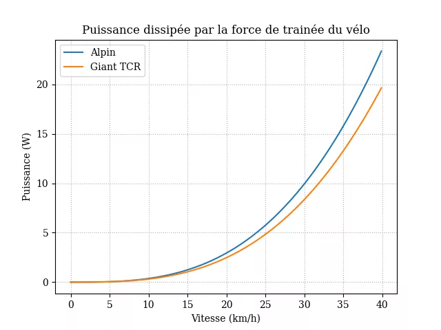 J’ai essayé d’estimer la puissance dissipée par mon vélo de route (Alpin) et un Giant TCR de passage à l’atelier, en estimant la surface frontale des vélos et en faisant le calcul avec un Cx de 0,4 pour l’Alpin et 0,3 pour le TCR. Le résultat, en fonction de la vitesse (jusqu’à 40 km/h) est donné dans le graphique ci-dessous :