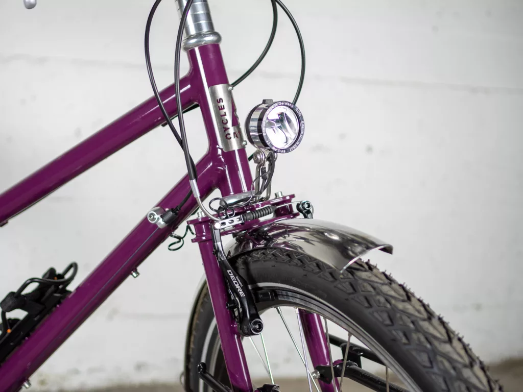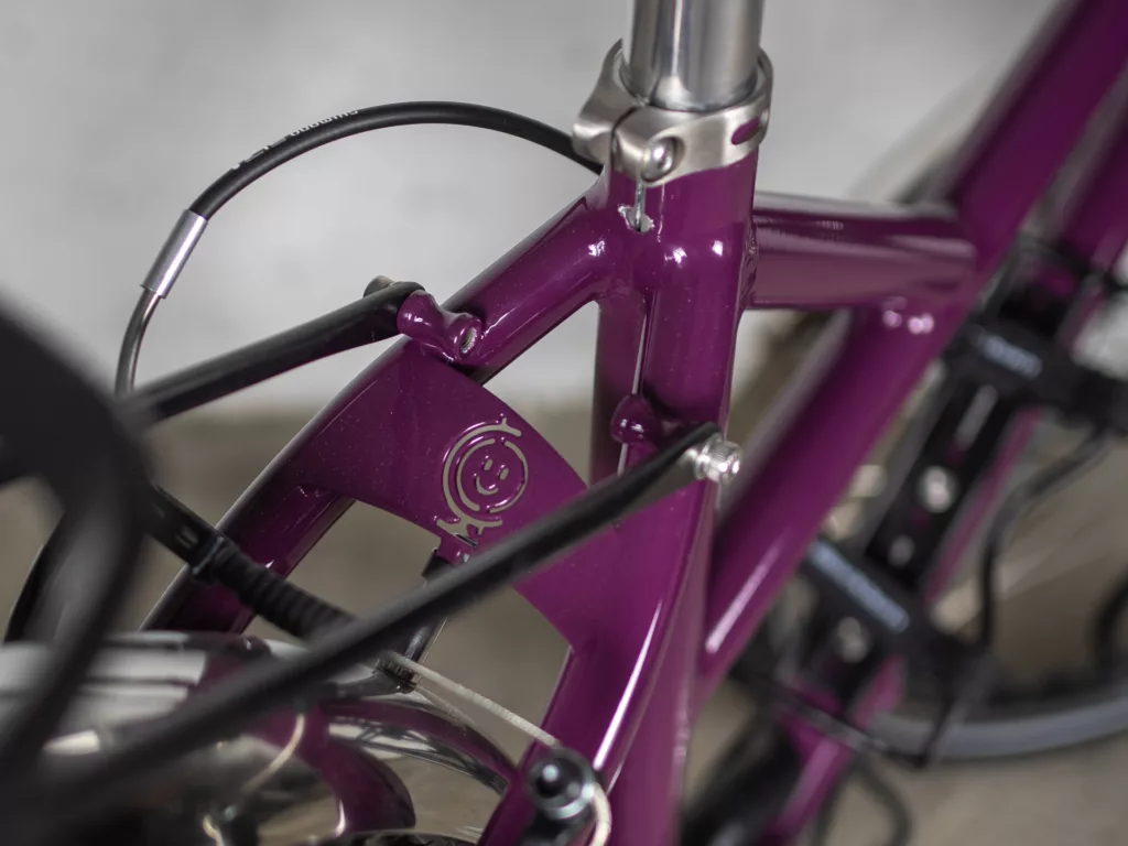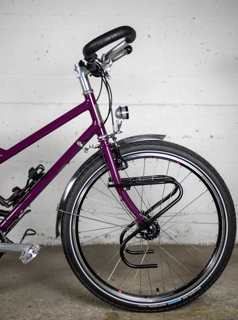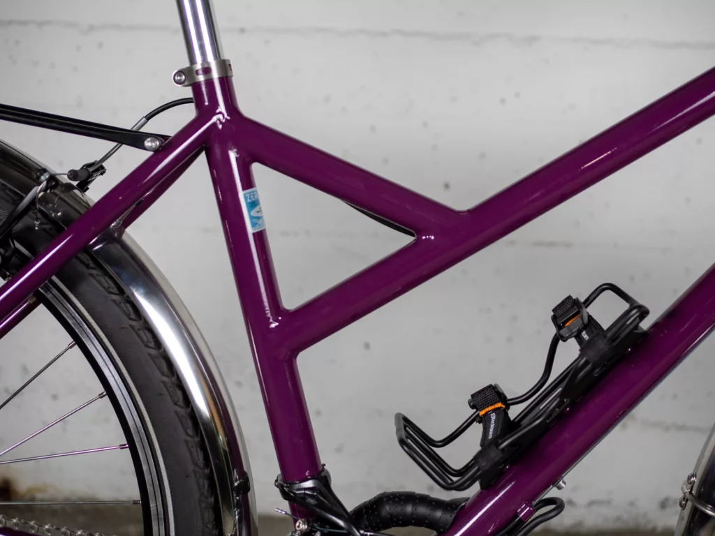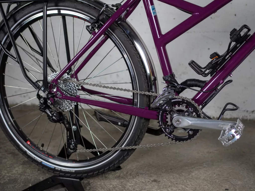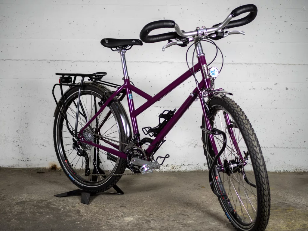 Le cadre est en géométrie trapèze (cadre « femme ») et roues de 26 pouces (pneus jusqu’à 2,2″) et il équipé avec garde-boue en inox et porte-bagage avant et arrière. Il a une transmission VTT double plateau 2×10 vitesses (36/22 devants et une cassette arrière 11/36 dents). Il dispose d’un éclairage par dynamo (le phare n’est plus celui des photos, mais un Bush&Muller IQ-XS)