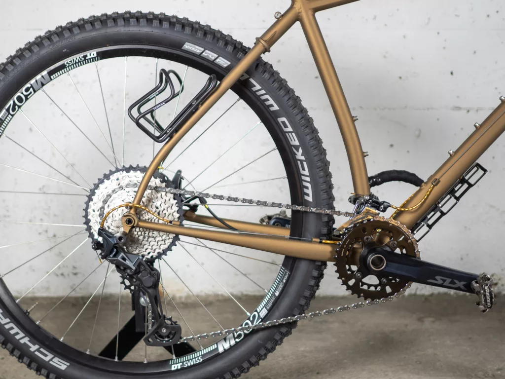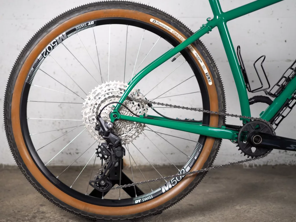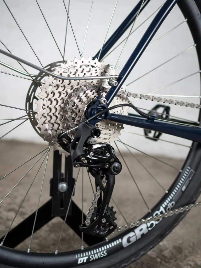 Les roues sont rayonnées à l’atelier avec les moyeux, rayons et jantes les plus adaptées à l’utilisation tout terrain. Les transmissions proposées ont été sélectionnées pour leur fiabilité et leur réparabilité.
