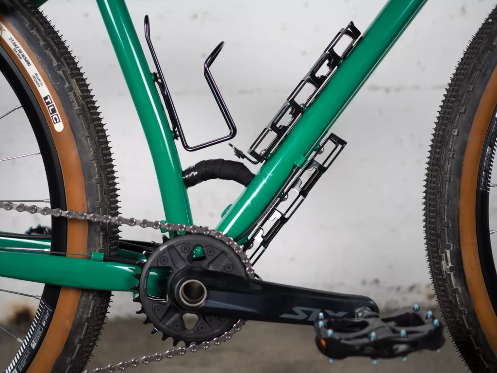 - Microshift Sword double (2×10 vitesses) ou mono plateau (1×10 vitesses). Avec un pédalier VTT, la transmission gravel qui devient tout terrain.