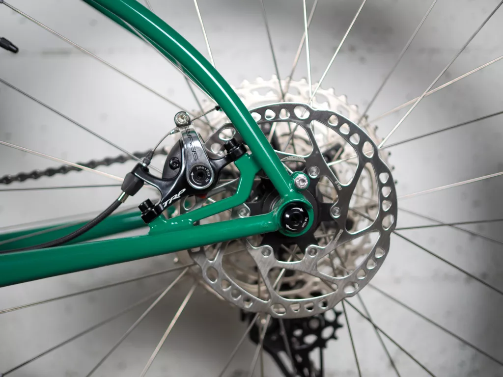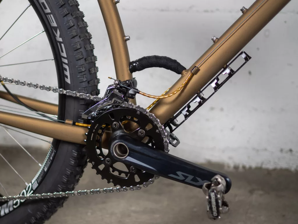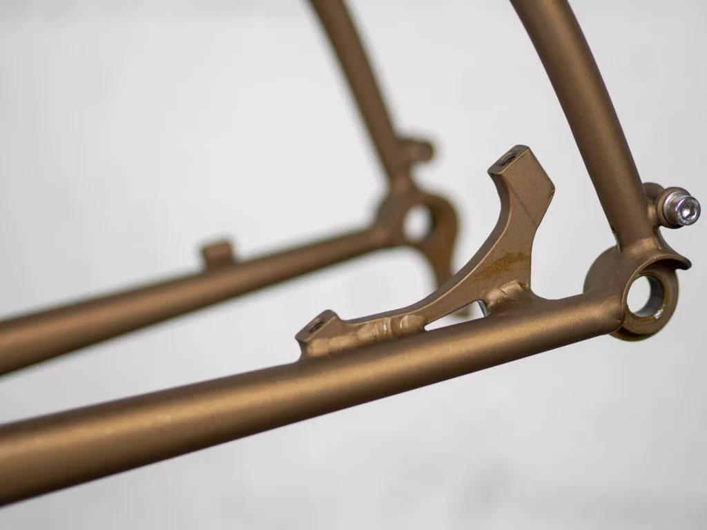 Le cadre est conçu pour pouvoir accepter une transmission à dérailleurs (mono ou double plateau) mais un montage avec un moyeu à vitesses intégrées Rohloff est possible en option. Nous avons aussi mis notre petite spécialité, la poignée de portage, pour faciliter les traversées de gué ou les changements de quais !