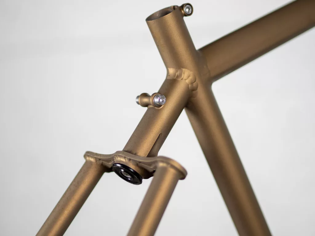 Cadre et fourche soudobrasés au laiton à partir de séries de tubes en acier Dedacciai Zero Uno et Columbus 29er dans notre atelier à Grenoble. Les brasures ne sont pas polies et conservent leur aspect brute