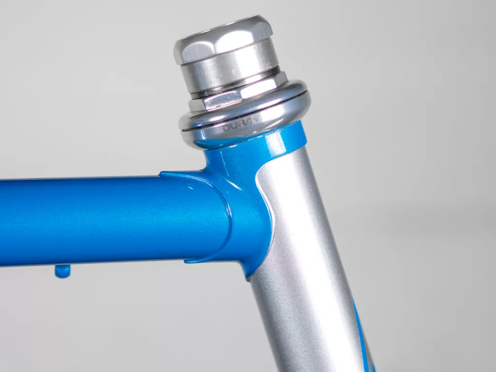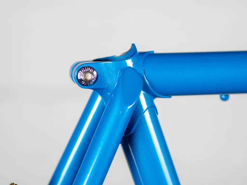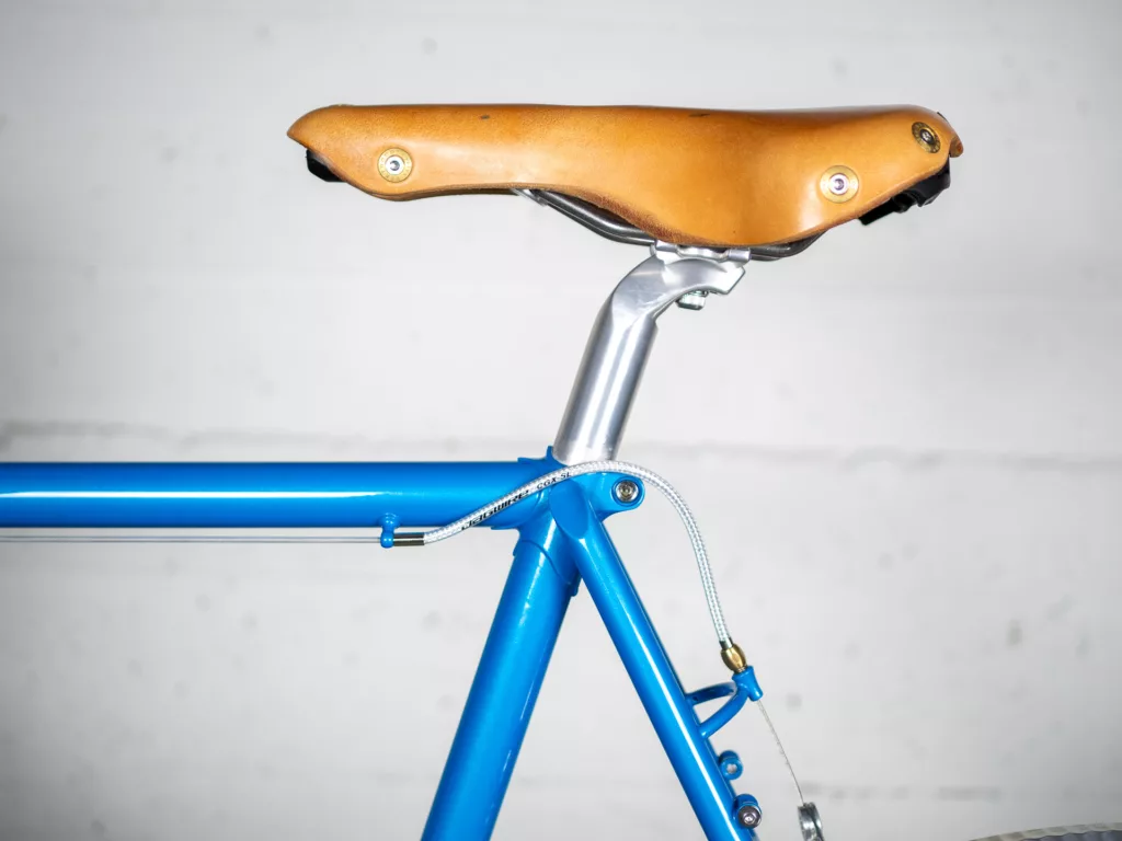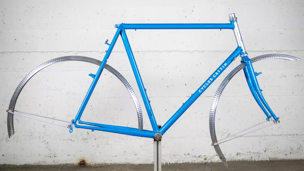 Le cadre est en acier léger (tubes Dedacciai Zero Uno et Columbus Zona) avec des raccords brasés à l’argent et des « petites » sections de tubes. La géométrie est tout à fait classique, avec le tube supérieur horizontal et des angles dans l’esprit des randonneuses du XXe siècle.