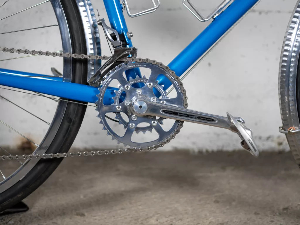 Choisir une transmission pour faire une randonneuse classique mais actuelle est un vrai casse-tête ! En effet, il existe de moins en moins de composants correspondant à l’esprit de l’époque, et comme l’idée est de construire la Belle Époque avec du neuf et non du vintage, il a fallu ruser. D’autant plus que l’utilisation de freins sur jante n’est plus un standard industriel en 2024. Notre choix c’est porté sur les deux transmission suivantes pour satisfaire les aficionados de Campagnolo et Shimano :